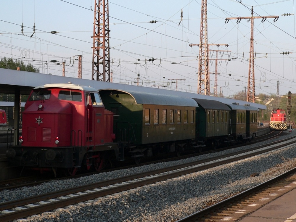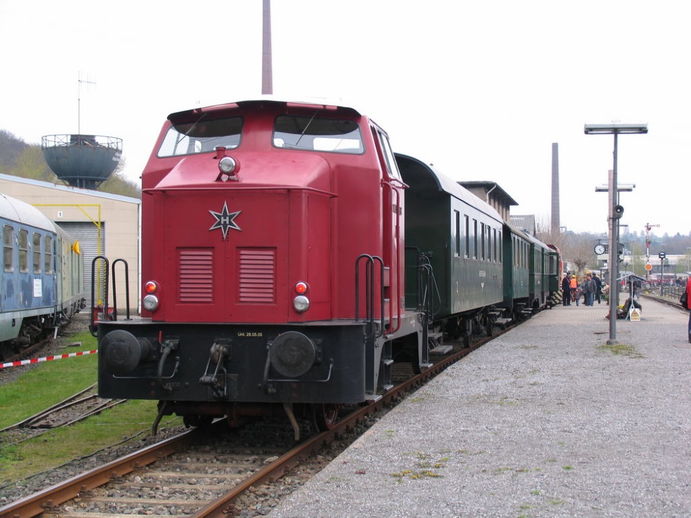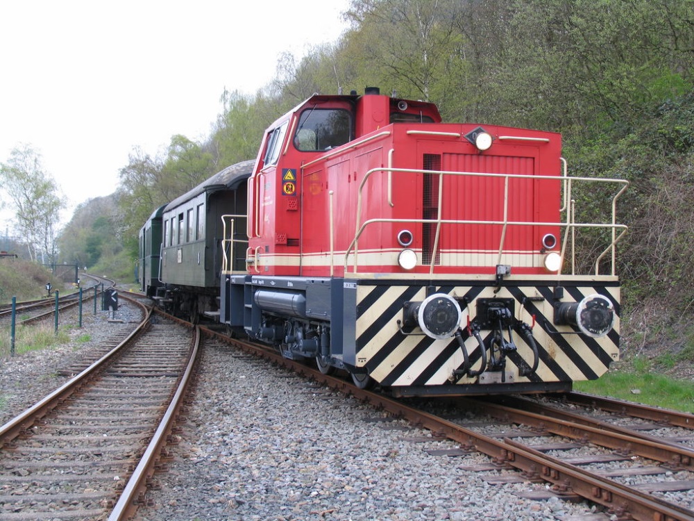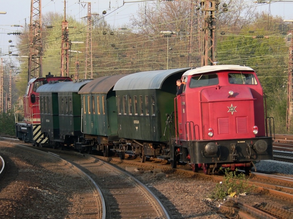 Rueckueberfuehrung nach Pendeleinsatz bei Fruehjahrs-Museumstage im Eisenbahnmuseum Bochum-Dahlhausen Am 19. und 20. April 2008 veranstaltete das DGEG-Eisenbahnmuseum Bochum-Dahlhausen wieder einen Fruehjahrs-Museumstag. Aus Anlass des 150. Geburtstages von Rudolf Diesel standen an diesem Wochenende die Diesellokomotiven von einst und jetzt im Mittelpunkt des Geschehens. Auch die Diesellok V9 der Hespertalbahn war an diesen beiden Tagen in Dahlhausen vertreten. Dabei zaehlte die V9 (Henschel, Baujahr 1957, Fabrik-Nr. 29201, Bauart Bdh, Leistung 240 PS) eher zu den Dieselloks von einst. Auch 3 Personenwagen hatte die Hespertalbahn mit nach Dahlhausen ueberfuehrt. Dabei handelte es sich um den Personenwagen "Zeche Poertingssiepen №2" (Kuenstler & Co, Baujahr 1910), den oesterreichischen Personenwagen 7139.06 (Simmering, Baujahr 1916) und den frischrenovierten "Wilhelmshavener" Grossraumwagen 2305 (Steinfurth, Baujahr 1941). Ergaenzt mit einem Personenwagen aus Bochum-Dahlhausen, der V9 und einer staendig wechselnden zweiten Lok, bildete dieses Ensemble den Pendelzug zwischen dem Eisenbahnmuseum und dem Bf. Dahlhausen. (Klicke auf die Bilder)