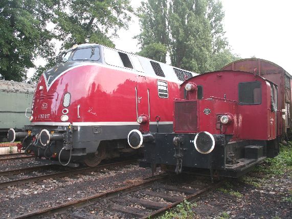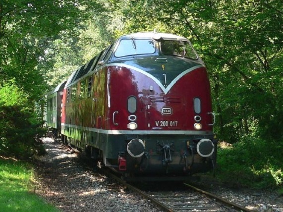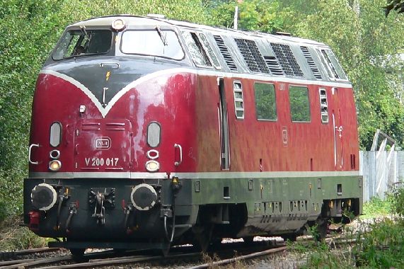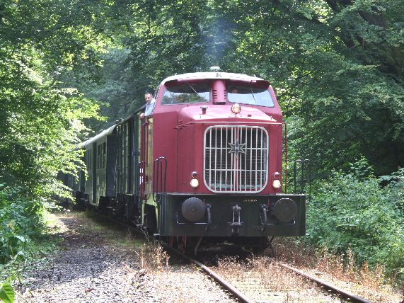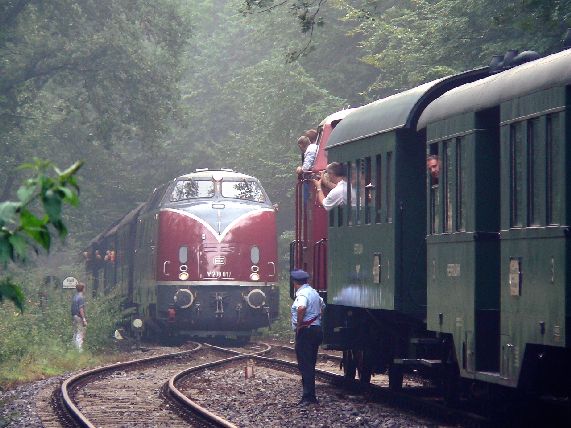 Doch kommen wir zurueck zu unseren beiden Damen. Weiter oben wurde schon erwaehnt, dass die zweimotorige Grossdiesellok der BR V200 aus den fuenfziger Jahren, einst Starlok der jungen Bundesbahn, inzwischen so etwas wie ein Vorzeigeobjekt fuer das Koennen der traditionsreichen Westfaelischen Lokomotivfabrik ist, welches seit Jahren in mancherlei Weise auch der Hespertalbahn zugutekam und kommt. Und bekannt ist auch, dass ein derartiges "Liebhaberstueck" frueher oder spaeter offiziell oder inoffiziell auch einen Namen bekommt.