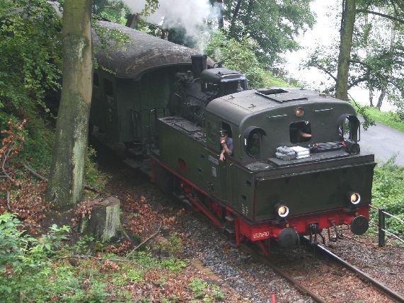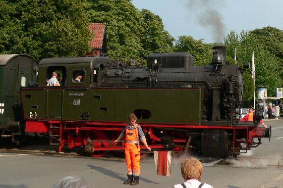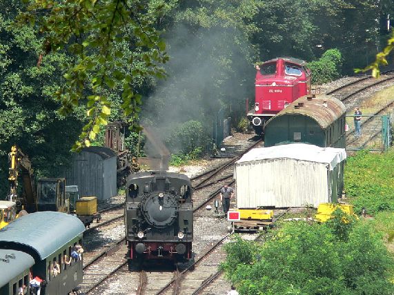 Der "grosse Auftritt" einer viel juengeren Dame am Rande des Sommerfestes hatte eine ganz andere Vorgeschichte: Fuer interessierte kleine Leute, die dem "Sendung-mit-der-Maus-Alter" bereits entwachsen sind, produziert die ARD die Reihe "Wissen macht Ah! technische Sachverhalte werden in dieser Sendung den Heranwachsenden durch allgemeinverstaendliche Erklaerungen naehergebracht. Und so setzte ein Kamerateam im Auftrag des WDR mit Hilfe von Lokfuehrer und Heizer und der D8 der Hespertalbahn das Vorhaben um, der etwa 20jaehrigen Hauptdarstellerin namens "Lola" die Funktionsweise einer Dampflok naeherzubringen.