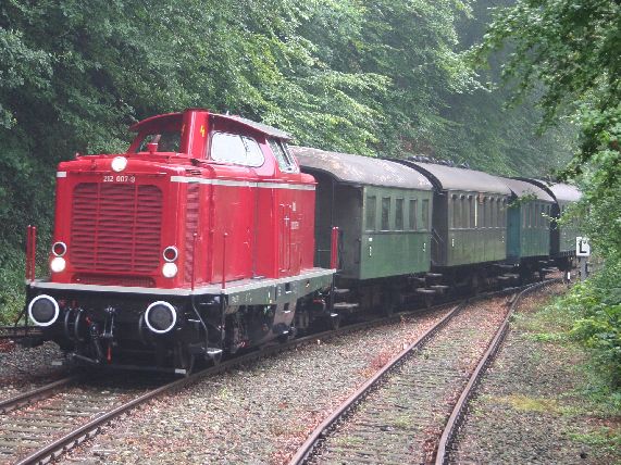 Sommerfest mit "Lola" und "Roswitha" Alljaehrlich veranstaltet die Hespertalbahn besondere Fahrtage, die dazu dienen sollen, ein breites Publikum anzusprechen und fuer die Hespertalbahn zu begeistern. In diesem Jahr waren mit "Lola" und "Roswitha" zwei besondere Damen bei uns zu Gast. Doch dazu spaeter mehr. (Klicke auf die Bilder) In der bekannten Betriebsweise der "ueberschlagenen Wende" pendelten am 27. Juli 2008 zwei Reisezuege, bunt zusammengestellt aus dem Museumszug der Hespertalbahn und den Wagen des Eisenbahnmuseums Bochum-Dahlhausen zwischen Essen-Kupferdreh und Haus Scheppen hin und her. Zugloks waren neben Lok D8 und V9 der Hespertalbahn die 212 007, ex Betriebshof Hagen, aus Dahlhausen und die aus dem Vorjahr bereits bekannte und beliebte V200 007, Starlok der Lokfabrik Reuschling aus Hattingen. Die Zuege verkehrten wie gewohnt im 40-Minuten-Takt.