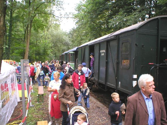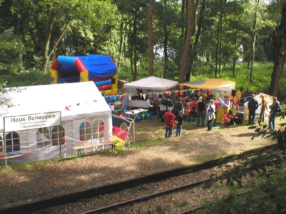 Wem dies alles noch nicht genug war, konnte mit diversen Kinderfahrzeugen den Vorplatz erkunden, malen, basteln oder sich anschminken lassen. Auch fuer das leibliche Wohl war gesorgt. Auf der kleinen, aber feinen "Fress- und Saufmeile", direkt an der Rueckseite des Bahnsteigs, gab es von diversen belegten Broetchen ueber frischgebackene Waffeln bis hin zur "Rostbratwurst im Dialog mit dem Broetchen", frischgezapftes Bier fuer die grossen Jungs, frischen Kaffee fuer die grossen Maedchen sowie diverse bekannte kohlesaeurehaltige Limonaden fuer die kleinen Fahrgaeste. Trotz des Aprilwetters im September war es fuer Gross und besonders fuer Klein wieder ein schoener und abwechslungsreicher Sonntagsausflug zur Hespertalbahn.