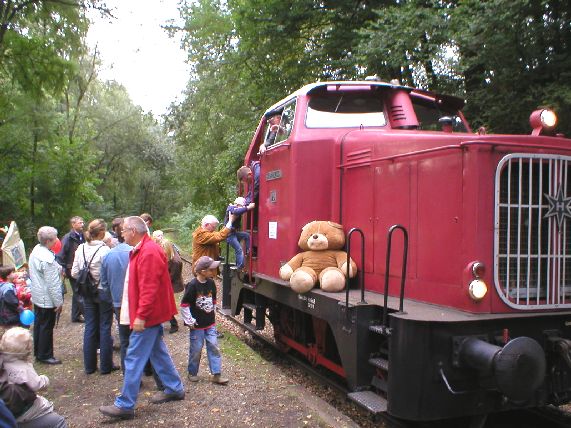 Bei den wieder kostenlos angebotenen Fuehrerstandsmitfahrten fuer Gross und Klein war dann ueberwiegend Papa gefragt. Hier konnte er mit seinem Nachwuchs das Gefuehl erleben, wie es ist, mit einer 50 Jahre alten 2-achsigen dieselgetriebenen Rangierlok mitzufahren.