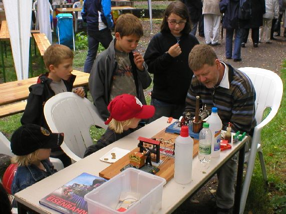 Mit grossen Augen und mit vielen Fragen wurde eine kleine Dampfmaschine bestaunt. Dieses funktionstuechtige Modell wurde wie in den letzten Jahren durch den Verein zur Verfuegung gestellt, beaufsichtig und betrieben. Die kleine pfeifende und dampfende Maschine trieb diverse Zusatzgeraete an. Dabei wurden u.a. ueber eine Transmission ein Scherenschleifer, welcher beim Schleifen der Schere die Funken fliegen liess oder trieb ein Hammerwerk an, welches drei hintereinander arbeitende Fallhaemmer in Funktion setze.