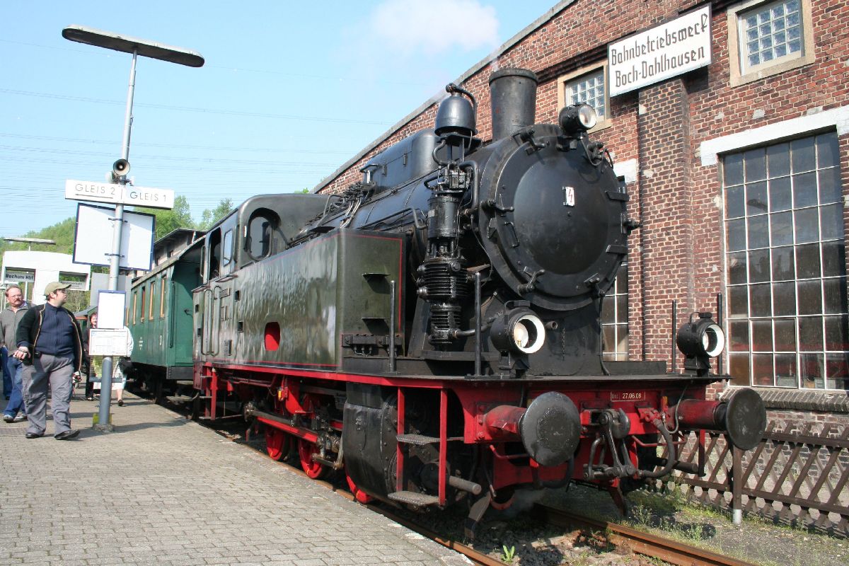 Links: Am Bahnsteig im Eisenbahnmuseum Bochum-Dahlhausen, der Zug der Hespertalbahn wartet mit der Dampflok D8 voraus auf den naechsten Pendeleinsatz.