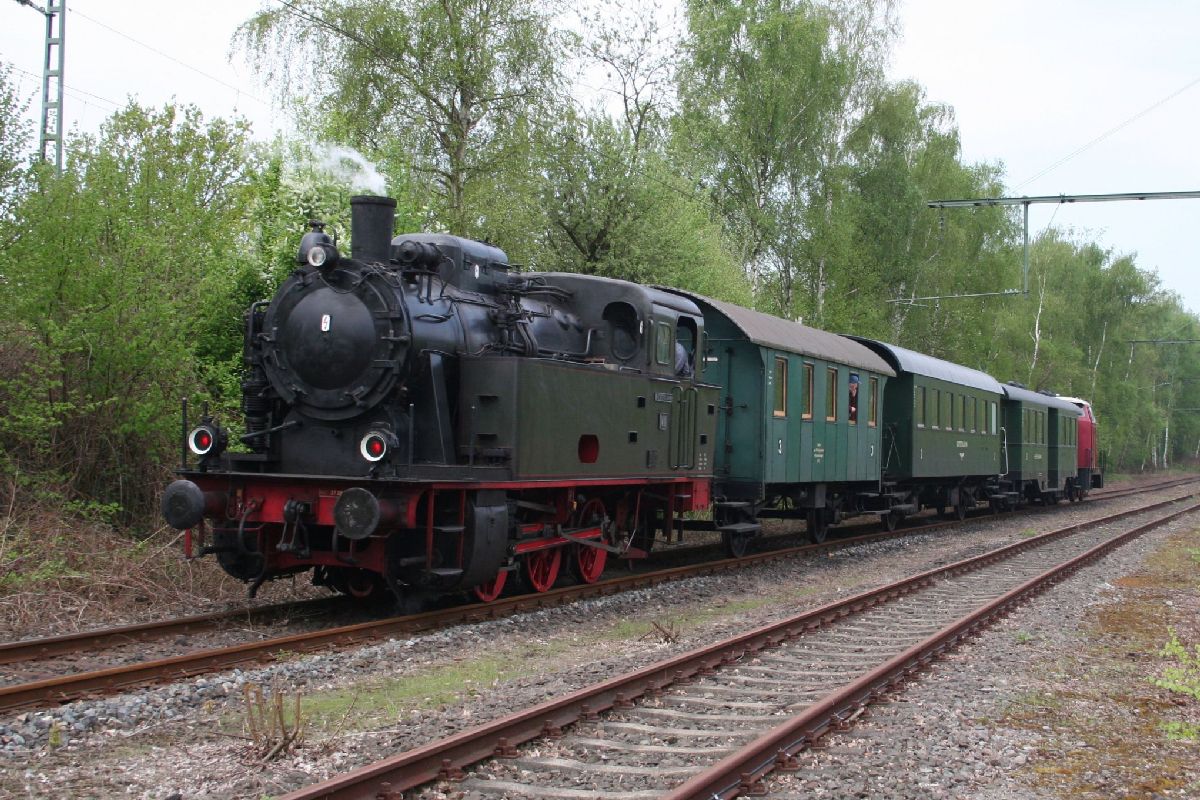 Am 1. Mai begann dann die Fahrsaison auch zwischen dem alten Bahnhof Kupferdreh und Haus Scheppen. Angesichts passabler Fruehlingstemperaturen waren die Museumszuege den ganzen Tag ueber recht gut frequentiert.