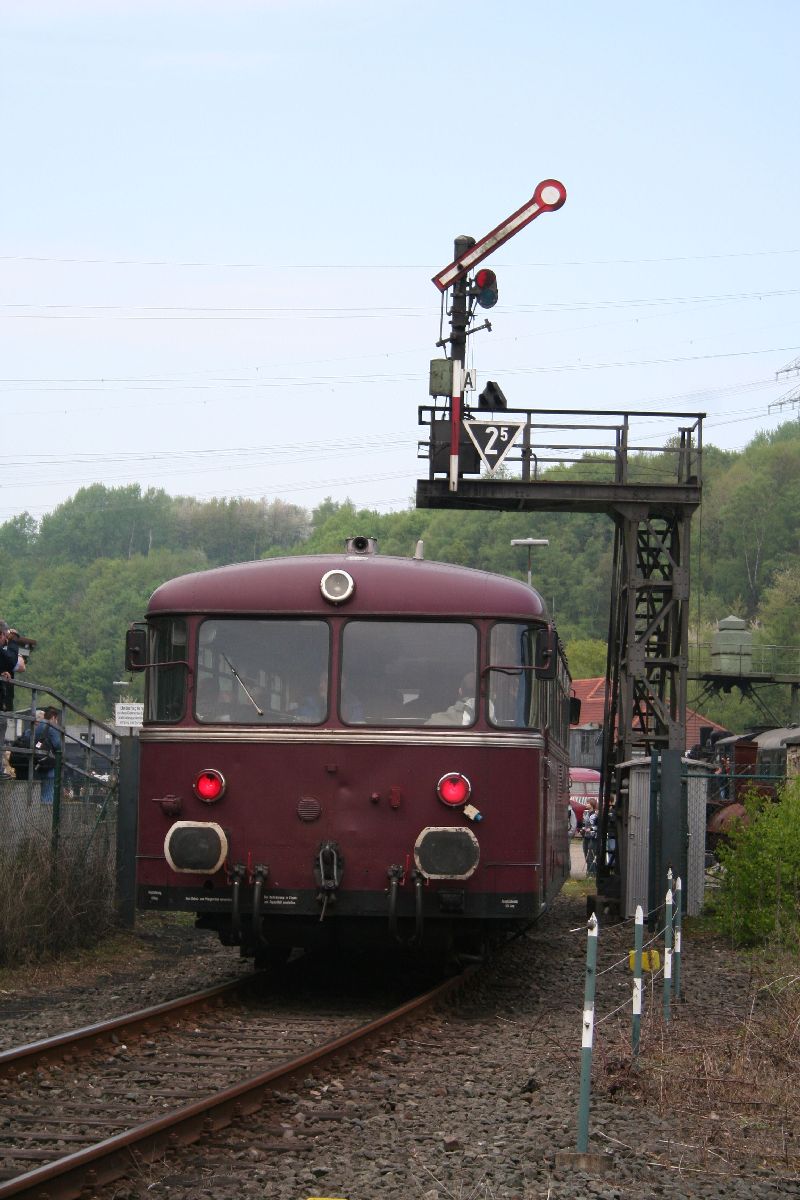 Im Wechsel mit dem Zug des Eisenbahnmuseums, der diesmal von 212 007 und der als Gast hinzugekommenen "Ochsenlok" 41 1144 der Interessengemeinschaft Werrabahn aus Eisenach verkehrte, fuhr ein "Sandwich" mit der Dampflok D8 und der Diesellok V9 sowie den Personenwagen 2303, 2186 und 1002 am 18. und 19.04.2009 mehrmals hin und her. Zwischenzeitlich traf auch die fahrplanmaessig auf der Ruhrtalbahn eingesetzte Schienenbusgarnitur immer mal wieder im Museum ein.