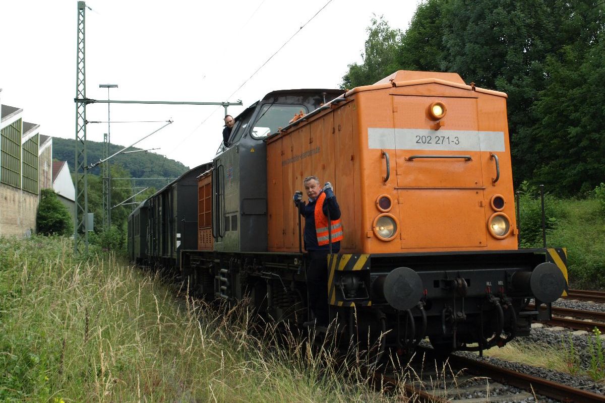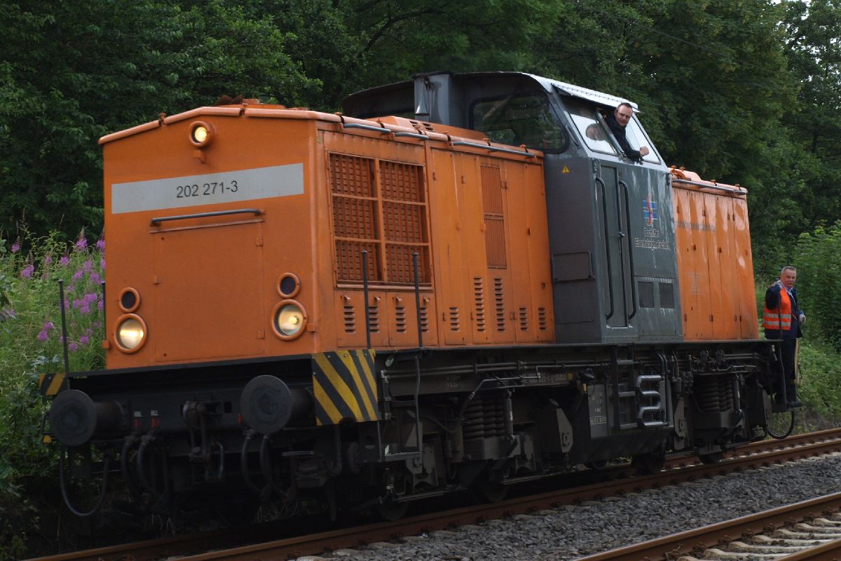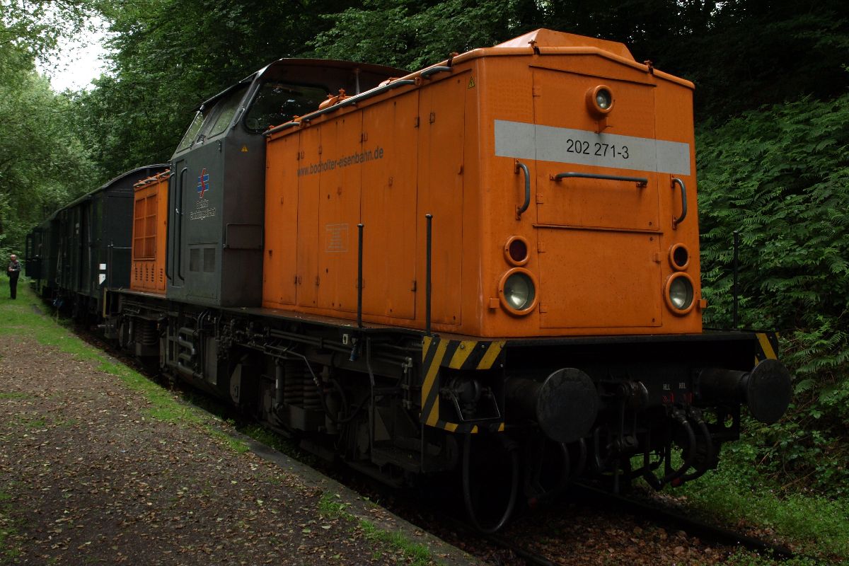 Als kleines Dankeschoen fuer ihre geleistete Arbeit hat die Hespertalbahn die Babcock-Mitarbeiter zu einer Sonderfahrt zur Hespertalbahn eingeladen. Zuglok fuer diese Sonderfahrt war die V100 Ost (202 271-3) der Bocholter Eisenbahngesellschaft. Die Hespertalbahn hat die Babcock-Mitarbeiter morgens mit einem Sonderzug im Oberhausener Hbf auf Gleis 14 abgeholt und abends nach einem abwechselungsreichen Tag dort wieder hingebracht.