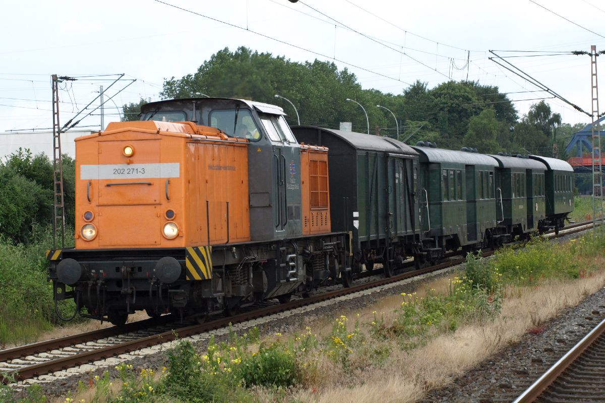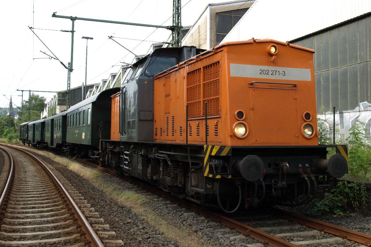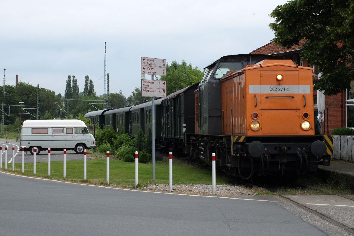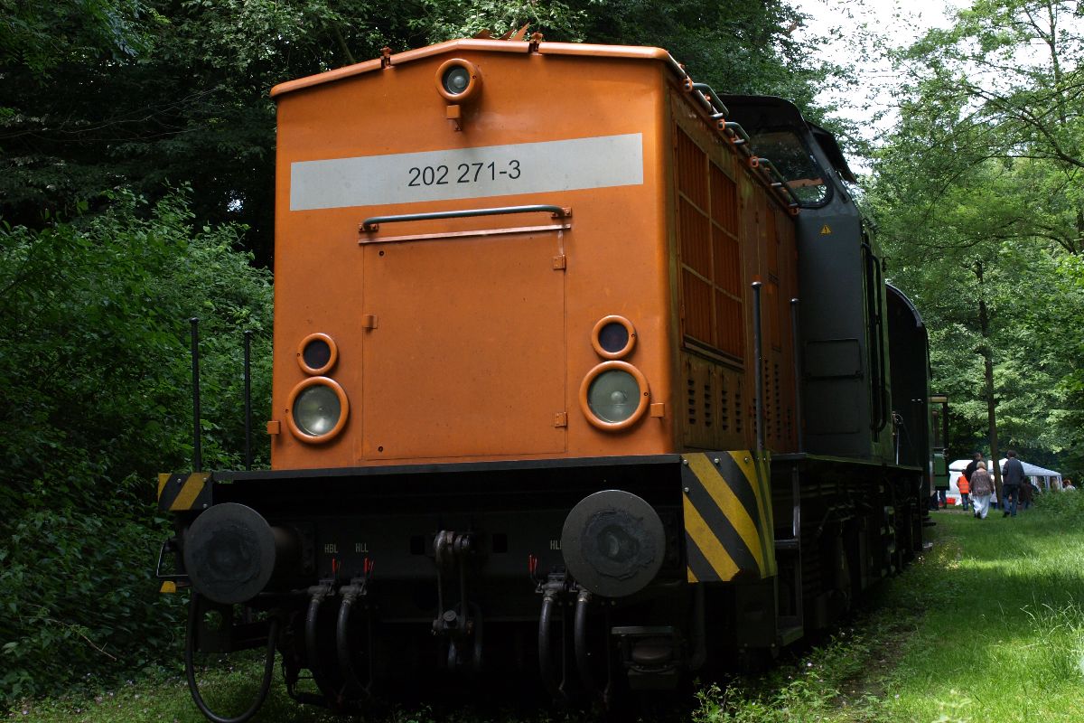 Als kleines Dankeschoen fuer ihre geleistete Arbeit hat die Hespertalbahn die Babcock-Mitarbeiter zu einer Sonderfahrt zur Hespertalbahn eingeladen. Zuglok fuer diese Sonderfahrt war die V100 Ost (202 271-3) der Bocholter Eisenbahngesellschaft. Die Hespertalbahn hat die Babcock-Mitarbeiter morgens mit einem Sonderzug im Oberhausener Hbf auf Gleis 14 abgeholt und abends nach einem abwechselungsreichen Tag dort wieder hingebracht.