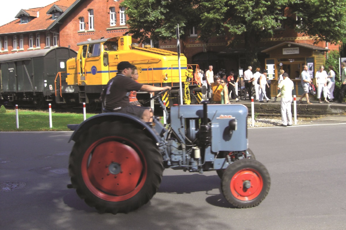 Ein alter Eicher Diesel Schlepper mit seinem luftgekuehlten 1 Zylinder Eicher-Diesel-Viertakt-Motor kreuzt den Weg der DHG 700 C.