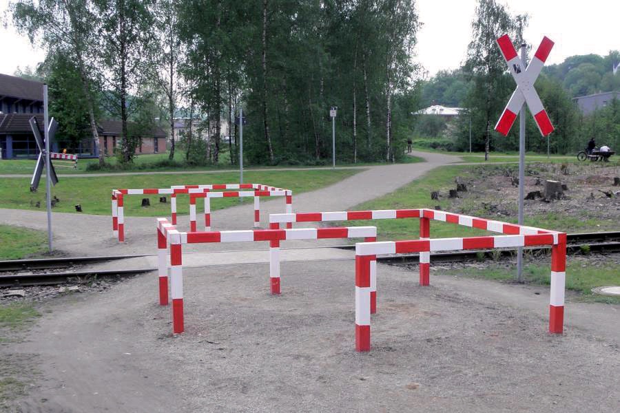 Die Anordnung der Absperrbaken ist so gewaehlt, dass der Fussgaenger bzw. Radfahrer vor dem Betreten des Gleisbereiches seinen Blick in beide Richtungen wenden muss, er kann dann ein nahendes Schienenfahrzeug erkennen und dieses aus sicherer Entfernung (vor oder innerhalb der Bakenkonstruktion) passieren lassen. Es gilt auch ohne "Andreaskreuz" (Zeichen 201 StVO) der Grundsatz: "Schienenfahrzeuge haben Vorrang" (Paragraph 19 StVO). Die gesamte Konstruktion dient somit der Sicherheit und ist bei einer Neueinrichtung eines Bahnueberganges so vorgeschrieben. Der Betreiber der Eisenbahn hat darauf keinen Einfluss.