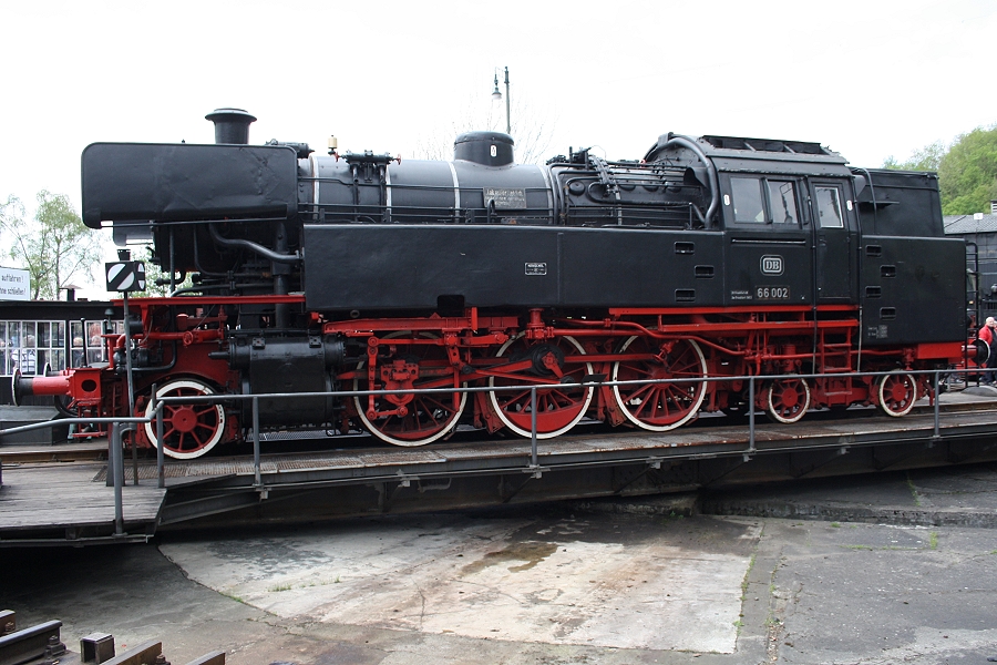 Die Dampflok 66 002 auf der Drehscheibe vor dem Ringlokschuppen im Museum.