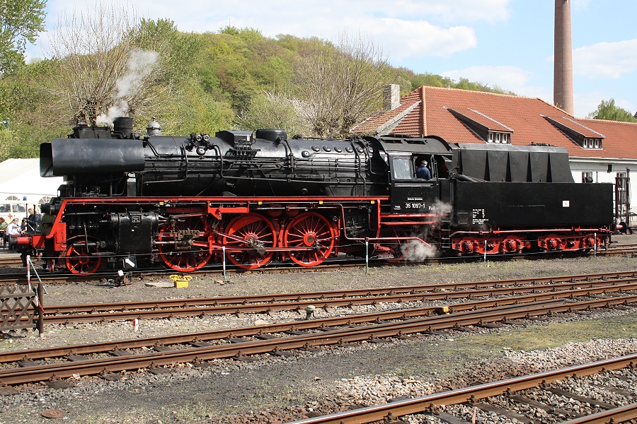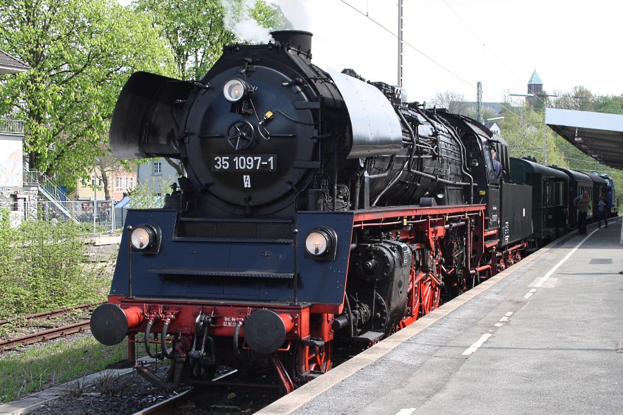 Ausserdem war mit 35 1097 aus Glauchau, dem Parallelentwurf zur Bundesbahn-Neubaulok Baureihe 23 aus den fuenfziger Jahren, auch eine Nachkriegskonstruktion der DDR-Reichsbahn zu Gast in Dahlhausen. Diese Lokomotive wurde im Jahre 1959 in Potsdam-Babelsberg gebaut, um aeltere Personenzugloks, insbesondere der in die Jahre gekommenen Baureihe 38.10-40 (preussische P8) zu ersetzen, was aber in Ost und West gleichermassen nicht recht gelang, weil weder die Bundesbahn-23er noch die Baureihe 35 an die grossen Stueckzahlen der 38er heranreichten. Und so dampften auch bei den Museumstagen wie schon vor rund 50 Jahren im Planbetrieb die 38 2267 des Eisenbahnmuseums und ihre saechsische "Abloesung" eintraechtig nebeneinander.