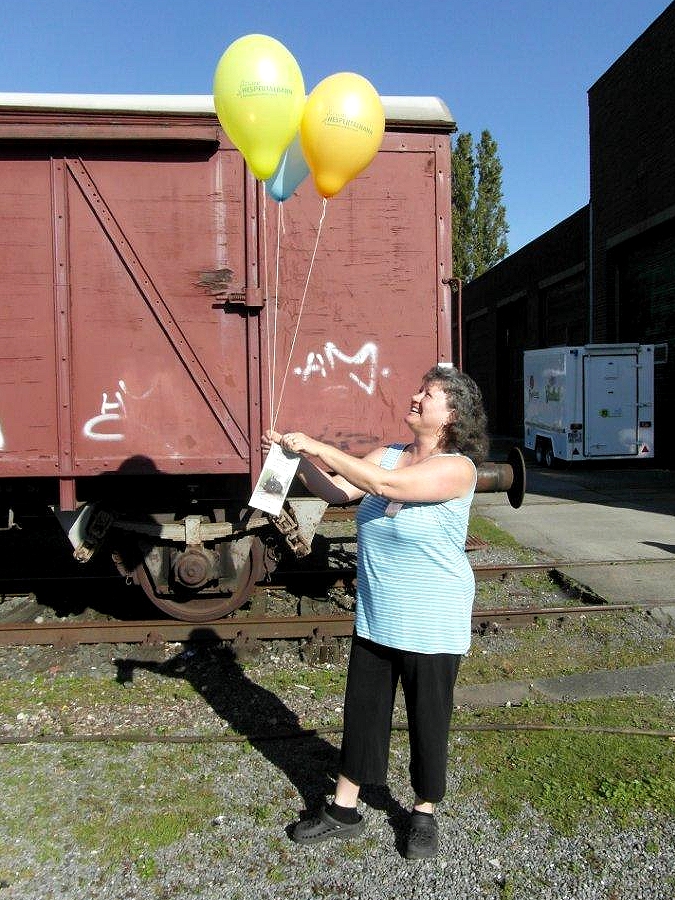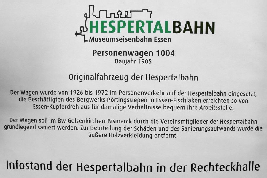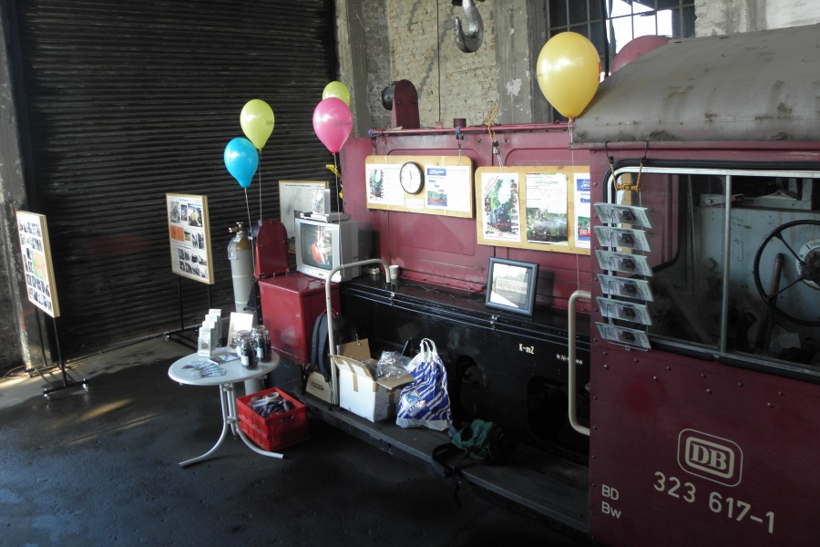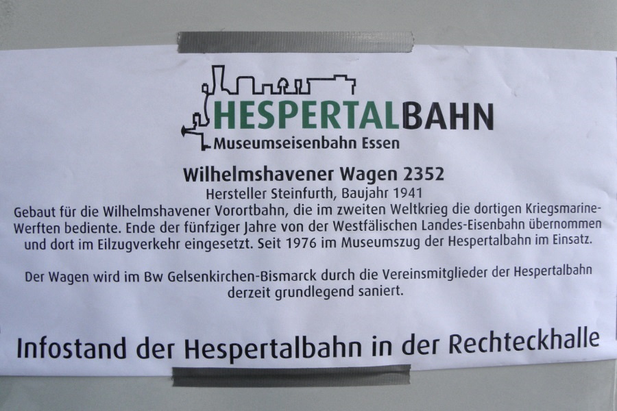 Die Hespertalbahn praesentierte sich an den beiden Tagen mit einem Stand in der Halle der Historische Eisenbahn Gelsenkirchen. Dabei wurde als Basis die in der Halle untergestellte Koef 2 mit der Betriebsnummer 323 617-1 genutzt. Diese Kleinlok der Leistungsklasse 2 gehoert Barbara Pirch und befindet sich z.Zt. als Leihgabe in der Obhut der Historischen Eisenbahn Gelsenkirchen (HEG). Vielen Besuchern konnte hier die Essener Museumsbahn am Baldeneysee sowie der geschichtliche Hintergrund der Bahn in Verbindung mit der Geschichte der Ruhrzechen naeher und bekannt gemacht werden. Es wurden Flyer und heliumgefuellte Ballons verteilt sowie das Buch und der Film zur Bahn verkauft. Weiterhin sorgte die Hespertalbahn mit frischen Kaffee und frischen Waffeln fuer das leibliche Wohl der Besucher.