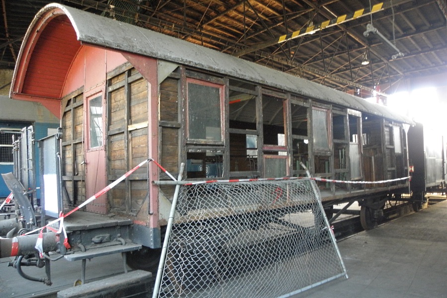 Der zur geplanten Aufarbeitung im Bw Gelsenkirchen-Bismarck untergestellte originale Personenwagen der Hespertalbahn "Poertingssiepenwagen №4".