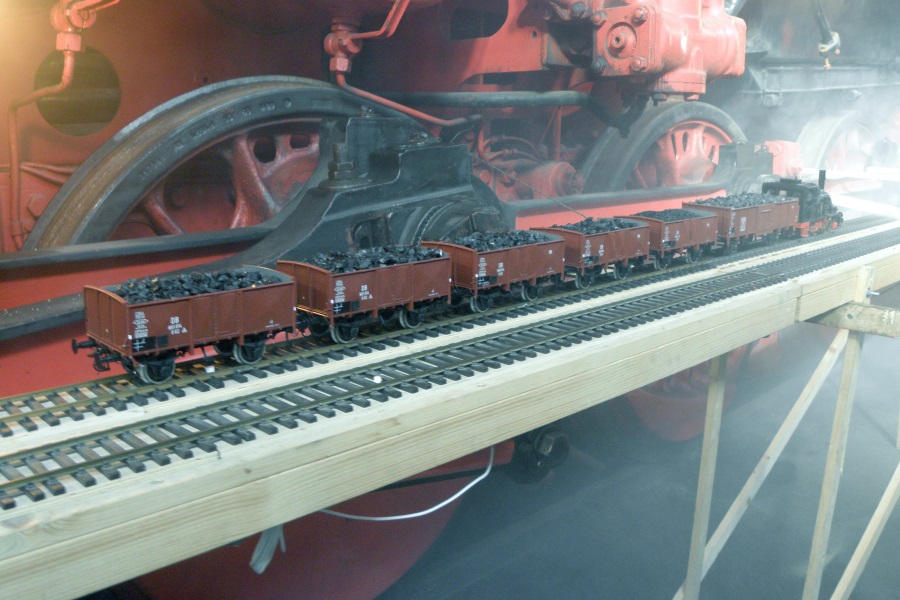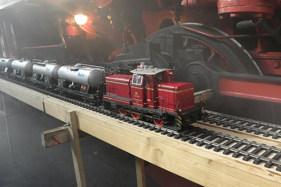 Vor dem Triebwerk der Dampflok 44 1558 in der Rechteckhalle der Historische Eisenbahn Gelsenkirchen war eine kleine Modellbahn ausgestellt.