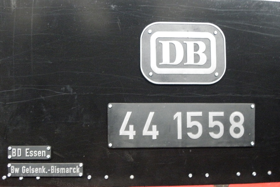 Die Dampflok 44 1558, ein sog. "Jumbo", eine schwere Einheits-Gueterzuglokomotive, in der Rechteckhalle der Historische Eisenbahn Gelsenkirchen.