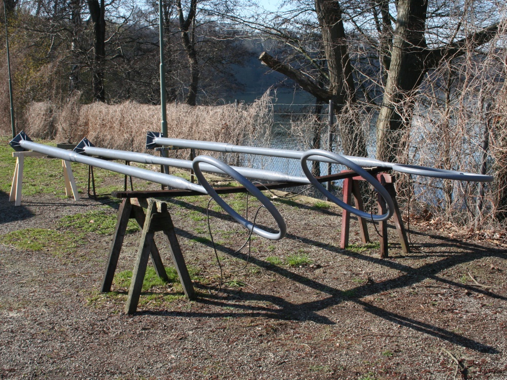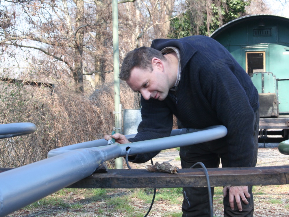 Daher wurde im Fruehjahr 2013 mit der Aufarbeitung der drei alten und dem Neubau von zwei baugleichen Lampen begonnen. Um die Lampen in die bereits vorhandenen Fundamentrohre stellen zu koennen, mussten die 3 alten Lampen verlaengert werden. Die hierfuer benoetigten Rohre wurden bei einem Lampenlieferanten bestellt. Diese Verlaengerungen haben auch die elektrische Verteilung aufgenommen. Zeitgleich wurden alte Lampenschirme aufgearbeitet, sowie zwei Lampenschirmhalterungen angefertigt. Da es sich urspruenglich um ein Gussteil handelt, die Hespertalbahn aber keine Giesserei ist, wurden diese Halterungen als Drehteil angefertigt. Nach dem Aufstellen und einem ersten Funktionstest waren die Vereinsmitglieder mit dem Ergebnis sehr zufrieden. Sieht der neuer Museumsbahnsteig in Essen-Kupferdreh, zusammen mit dem Bahnhofsschild und den alten Baenken, nun doch sehr nach einer Museumseisenbahn aus.