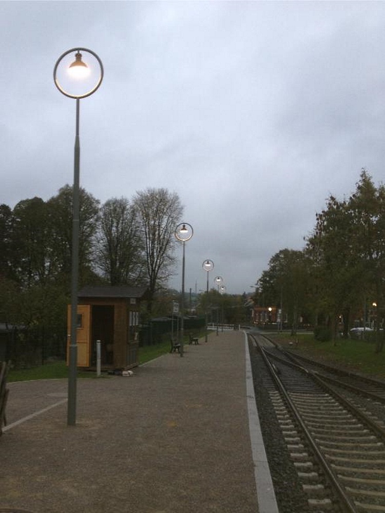"Es werde Licht!": Neuer Bahnsteig mit historischen Leuchten Zu einer Museumsbahn gehoeren nicht nur historische Loks und Wagen eines Museumszuges, sondern auch das entsprechende "Drum und Dran". Das faengt bei der Hespertalbahn mit der authentischen "Dienstbekleidung" des Zugpersonals -Lokfuehrer, Schaffner und Zugfuehrer- an, geht ueber den historischen Prellbock am Streckenende am Haus Scheppen oder die als Blickfang aufgestellten Kohlehunt auf dem Bahnsteig bis hin zu den wenn auch nicht original-alt, so doch mit authentischen Schrifttypen in traditioneller Machart hergestellten Bahnsteigschildern. Und waehrend am Bahnsteig Zementfabrik bereits seit Jahrzehnten historische Leuchten zu spaeter Stunde fuer ausreichende Beleuchtung sorgen, galt es auch in Kupferdreh, ein wenig mehr Licht ins Dunkel zu bringen.