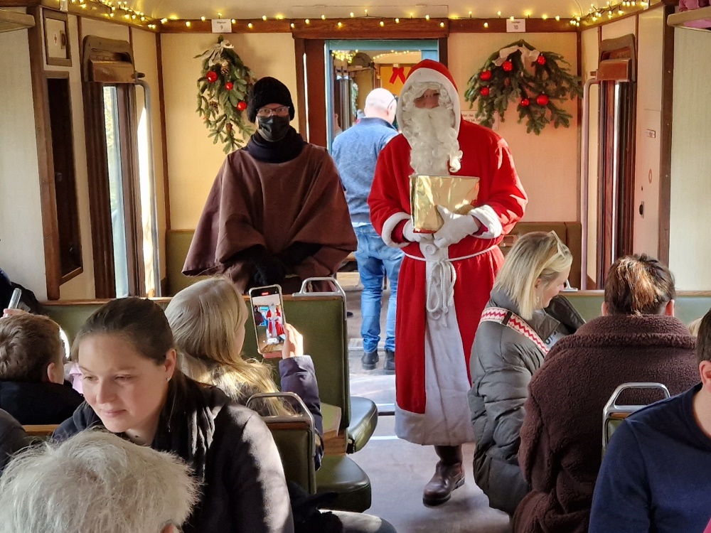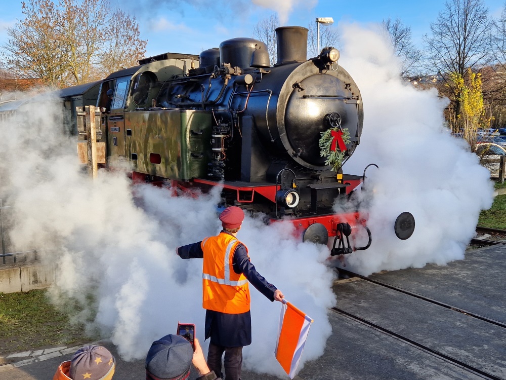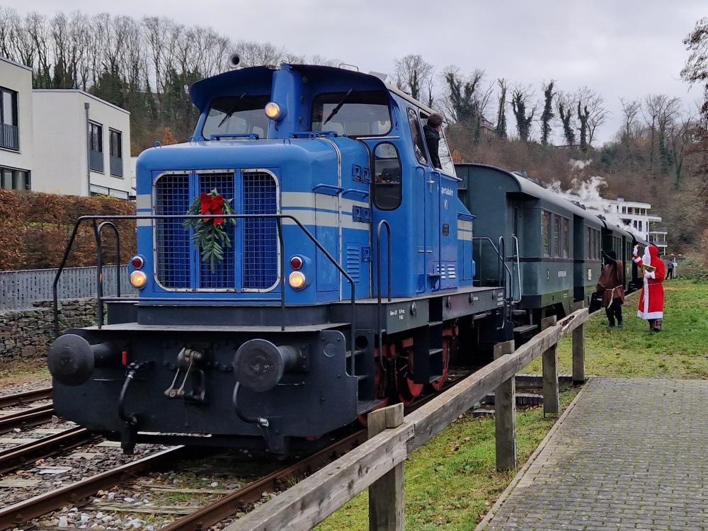 Der Nikolausexpress macht sich auf dem Weg Richtung Bahnhof Zementfabrik, um den Nikolaus und seinen Gehilfen Knecht Ruprecht aufzunehmen.