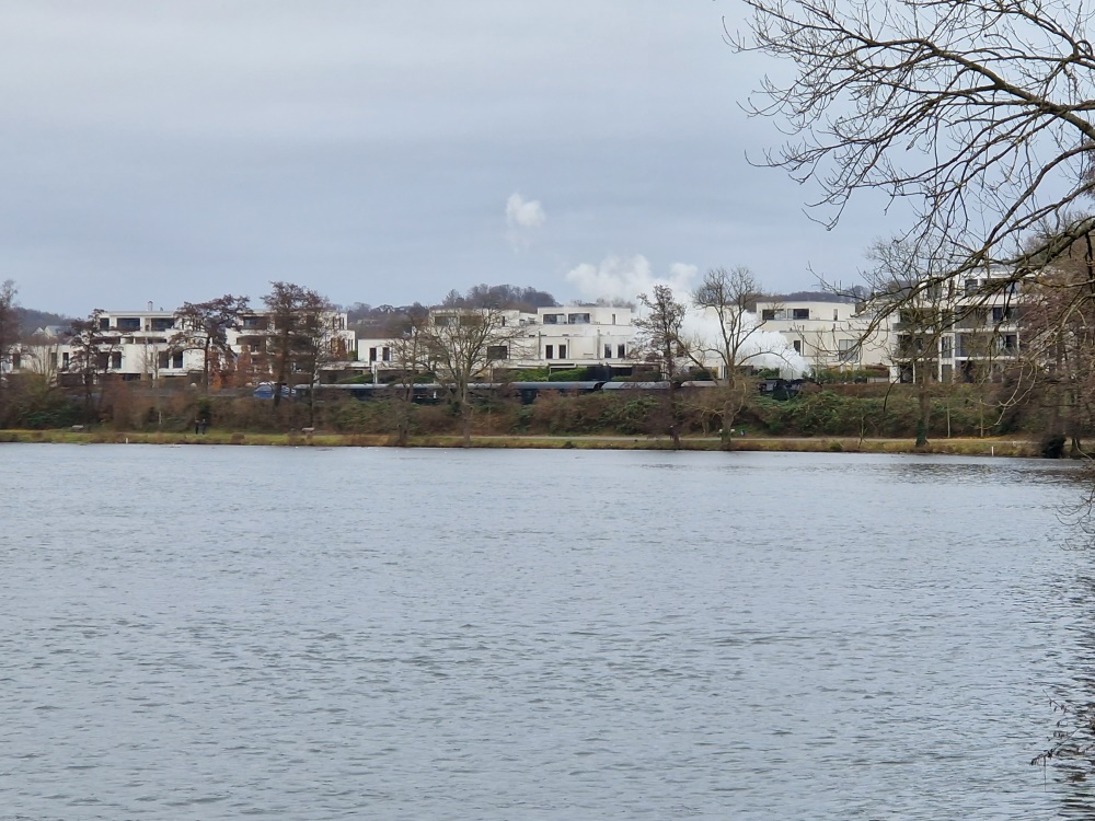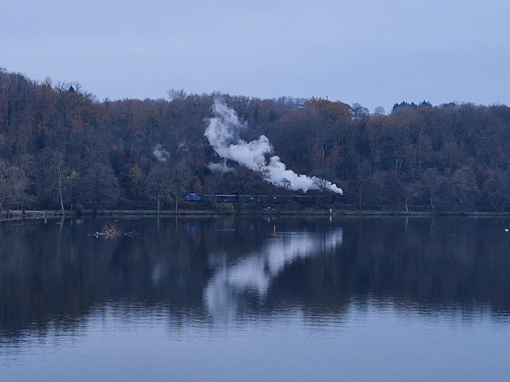 Blick ueber den Baldeneysee auf den Nikolausexpress in der schneelosen Winterlandschaft.