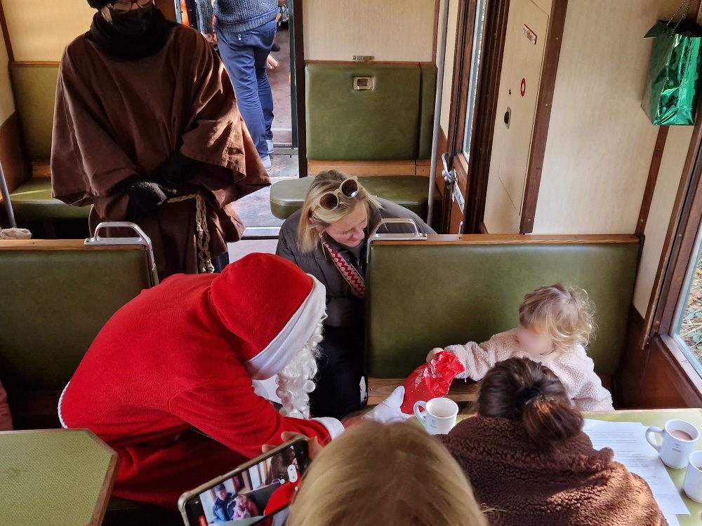 Der Nikolaus und sein Gehilfe Knecht Ruprecht begruessen die Kinder in dem Personenwagen, setzen sich anschliessend zu jedem Kind und ueberreichen die Nikolaustuete.