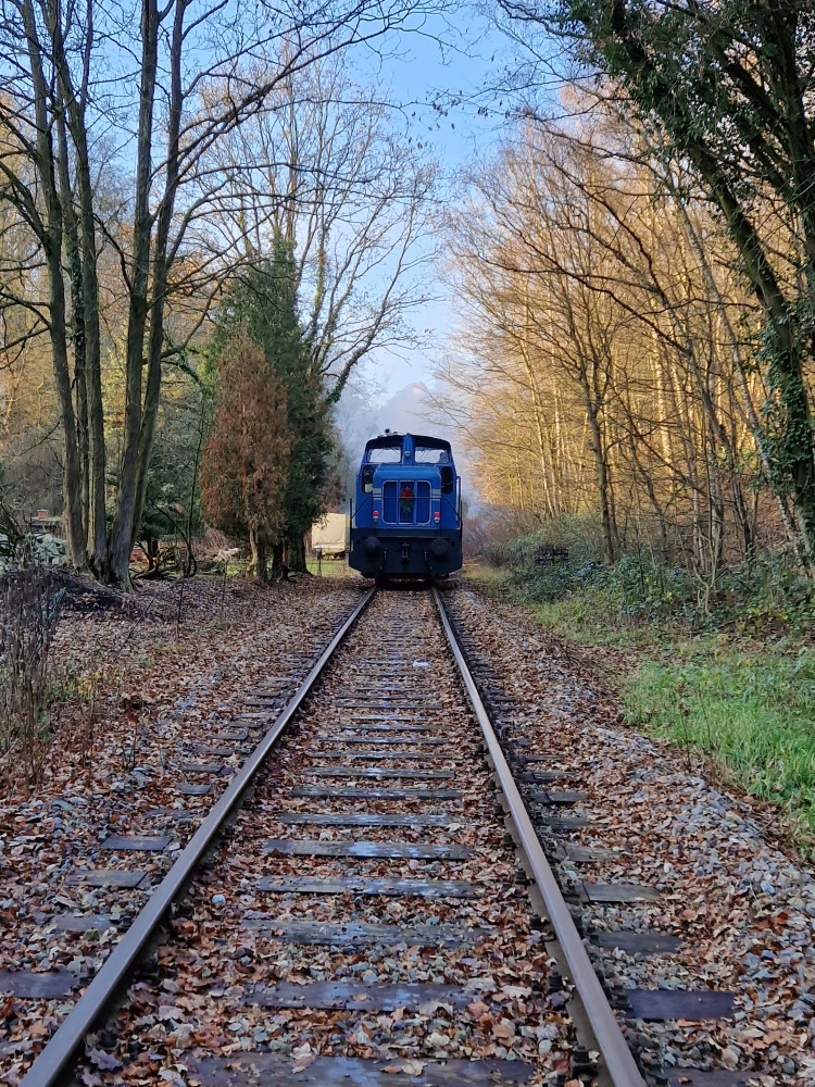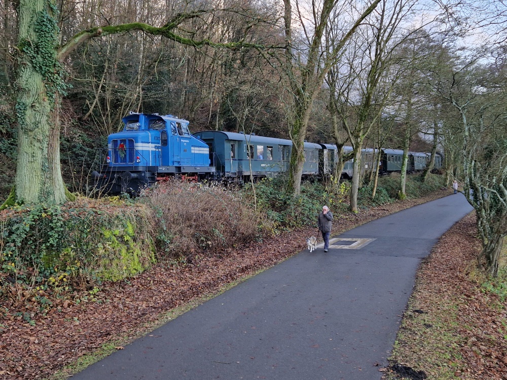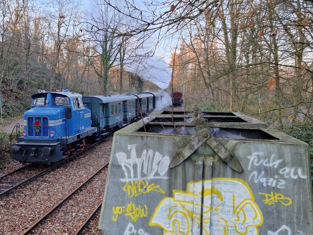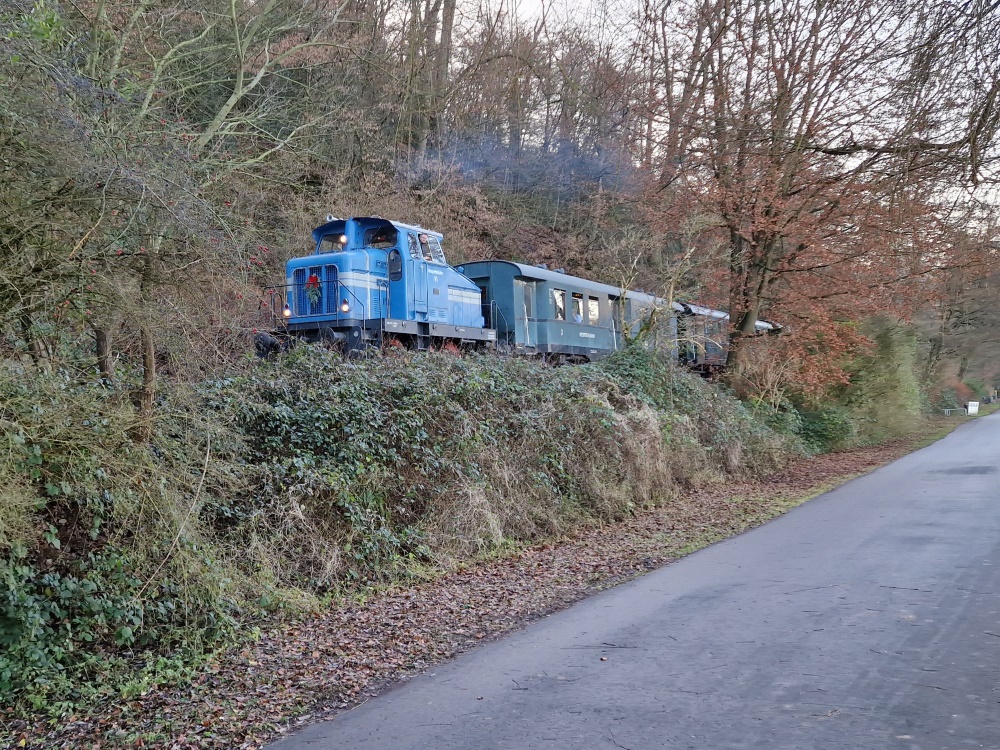 Der Nikolausexpress auf seinem Weg zurueck zum Ausgangspunkt dem Museumsbahnsteig der Hespertalbahn in Essen-Kupferdreh.